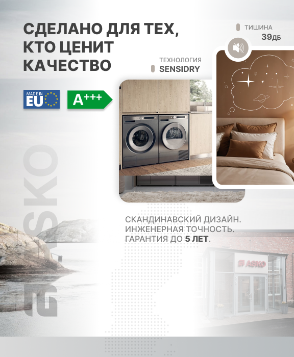Техника ASKO сочетает современный скандинавский дизайн, долговечные материалы и точную сборку. Именно это обеспечивает надежную работу приборов и их востребованность среди пользователей, ценящих функциональность и эстетику.