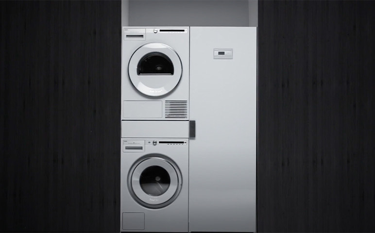 Прибор можно монтировать в колонну со стиральной машиной, что экономит место в помещении. Дверца фронтальная и перенавешиваемая — можно адаптировать под планировку. Конденсат собирается в встроенный контейнер или отводится напрямую в канализацию, также предусмотрена возможность подключения внешнего монетоприёмника для коммерческого использования.