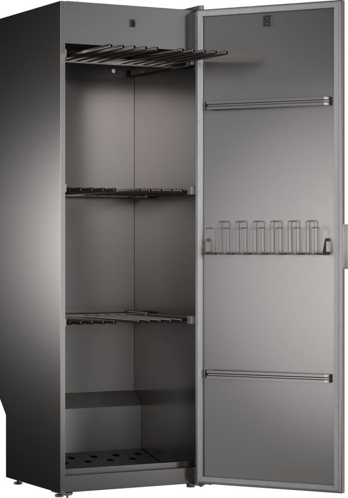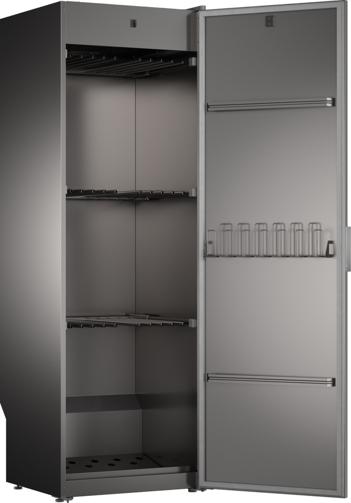 Сушильный шкаф в цвете титан. Бережная сушка деликатных вещей, обуви и перчаток на вешалках длиной 16 метров. Вентиляционный тип, 8 программ и бесшумная работа для вашей идеальной прачечной.