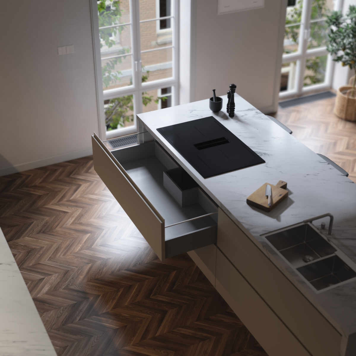 - Встроенная выдвижная вытяжка (downdraft) — компактность и современный внешний вид без традиционной навесной вытяжки.